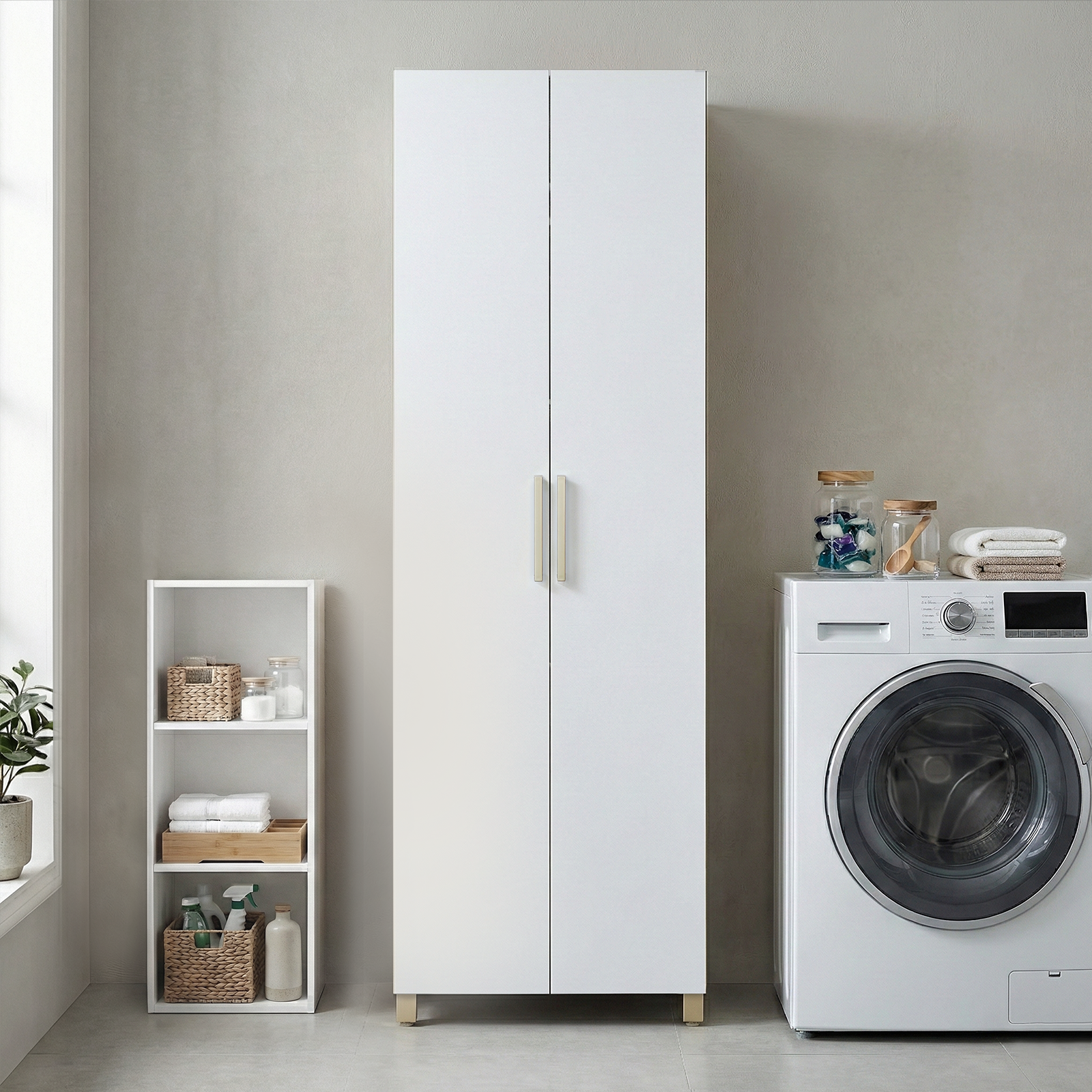 Já o Armário Multiuso Jade foi desenvolvido especialmente para a lavanderia. Suas prateleiras e nichos organizam produtos de limpeza, cestos e acessórios de uso diário com facilidade e eficiência.